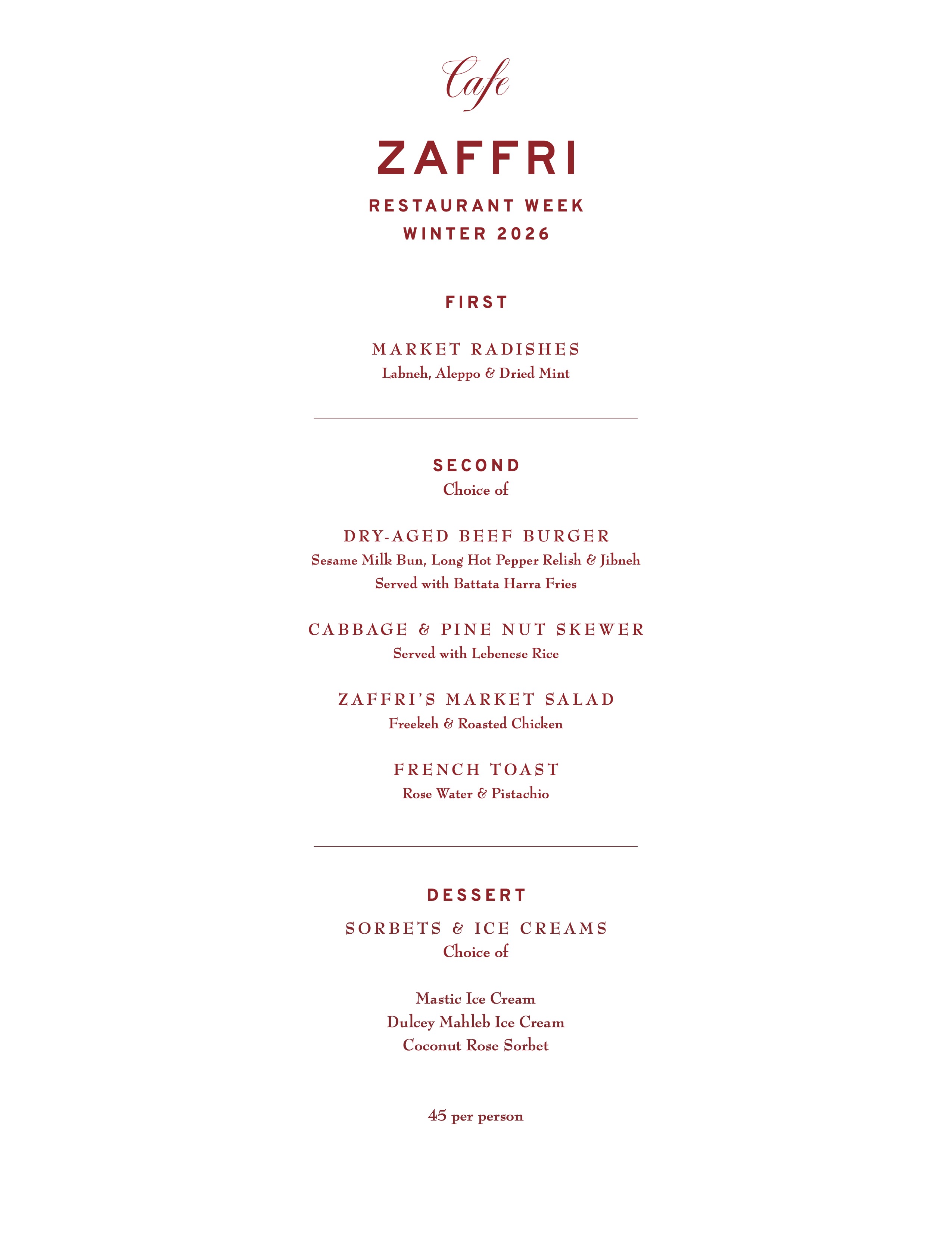 45 per person Served from 11:30AM to 3:30PMFirst